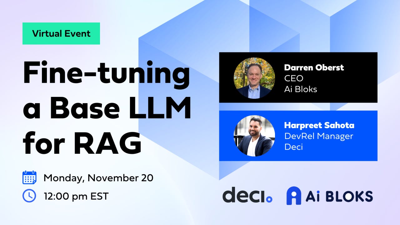 Nov 20 - How to Fine-tune a Base LLM for Retrieval Augmented Generation (RAG): In a webinar, Deci and Ai Bloks will demonstrate the integration of Deci LM-6B LLM - fine-tuned for RAG - into a RAG workflow using Ai Bloks' open-source library, llmware. The webinar will focus on use cases in financial services, legal and compliance.
